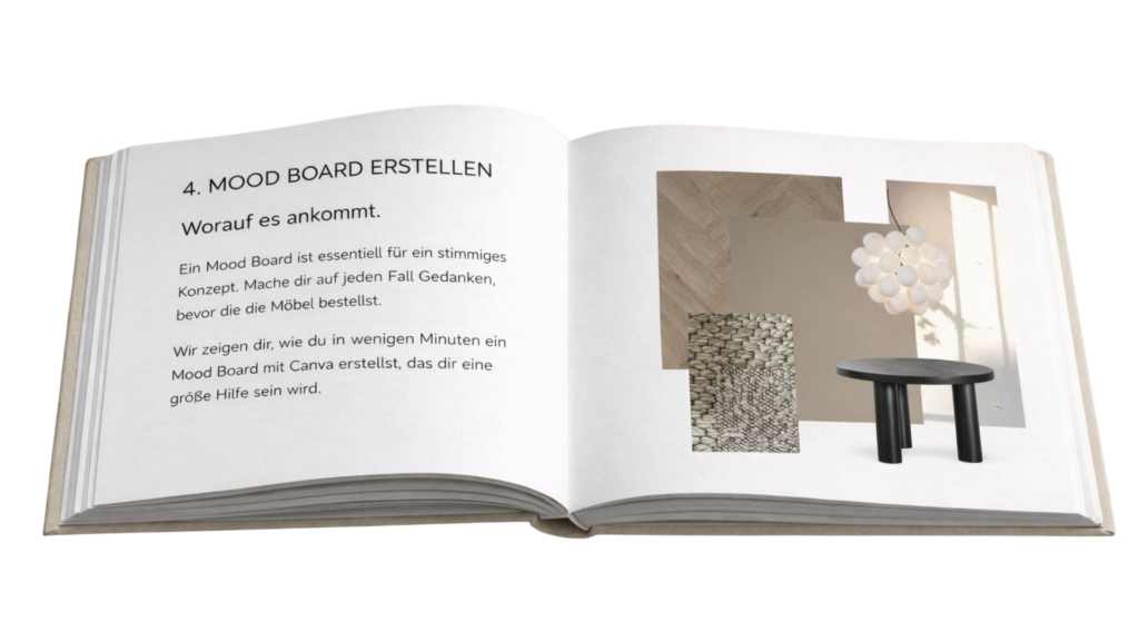 Mache dir unbedingt vorher Gedanken, bevor du alle Möbel bestellst. Das spart so unheimlich viel Stress und reduziert das Risiko vor Umtausche deutlich. In unserem kostenlosen INTERIOR WORKBOOK zeigen wir dir, wie du in wenigen Minuten ein richtig schickes und hilfreiches Mood Board erstellst, auch ohne Vorkenntnisse.