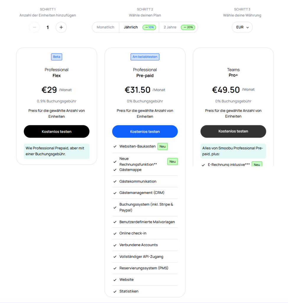 Die Preise bei Smoobu stellen sich derzeit wie folgt dar. Ich bin mit dem Professional-Tarif sehr zufrieden und würde da auch zu raten. Bei 4 Einheiten kostet mich Smoobu gerade mal 76 Euro brutto, als weit unter 1 % des Umsatzes. Und ist damit im Vergleich mit anderen immer noch verdammt günstig.